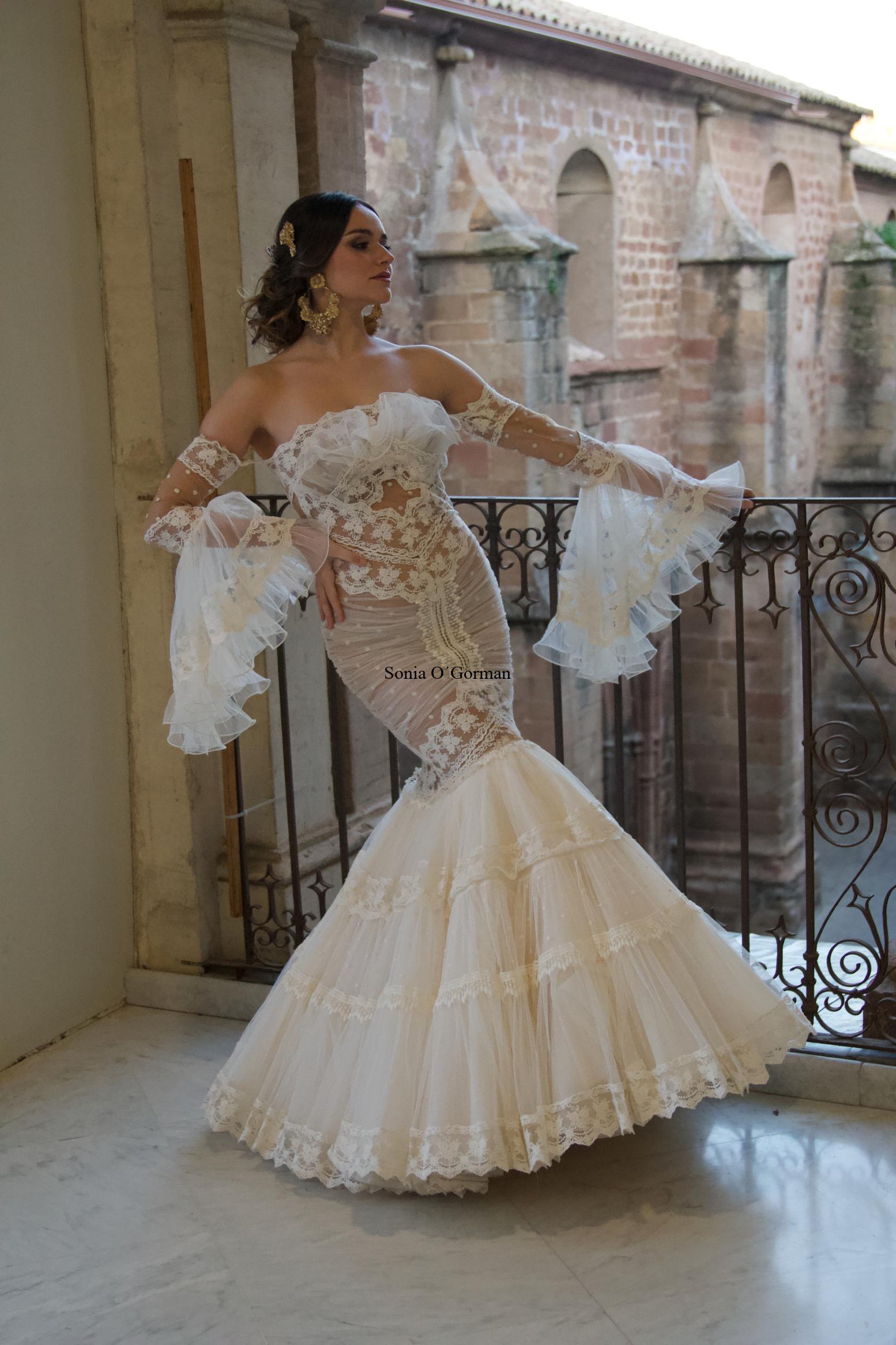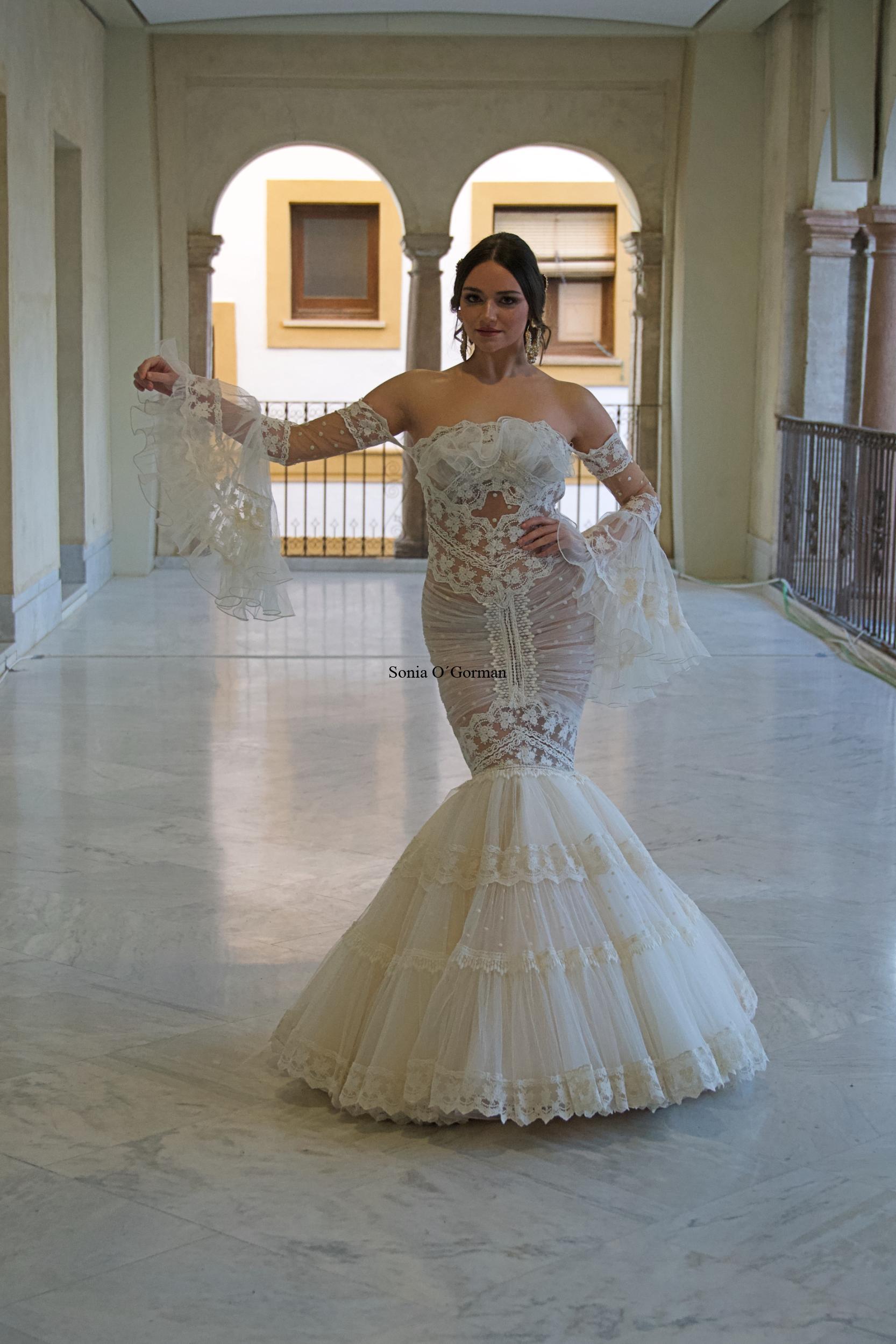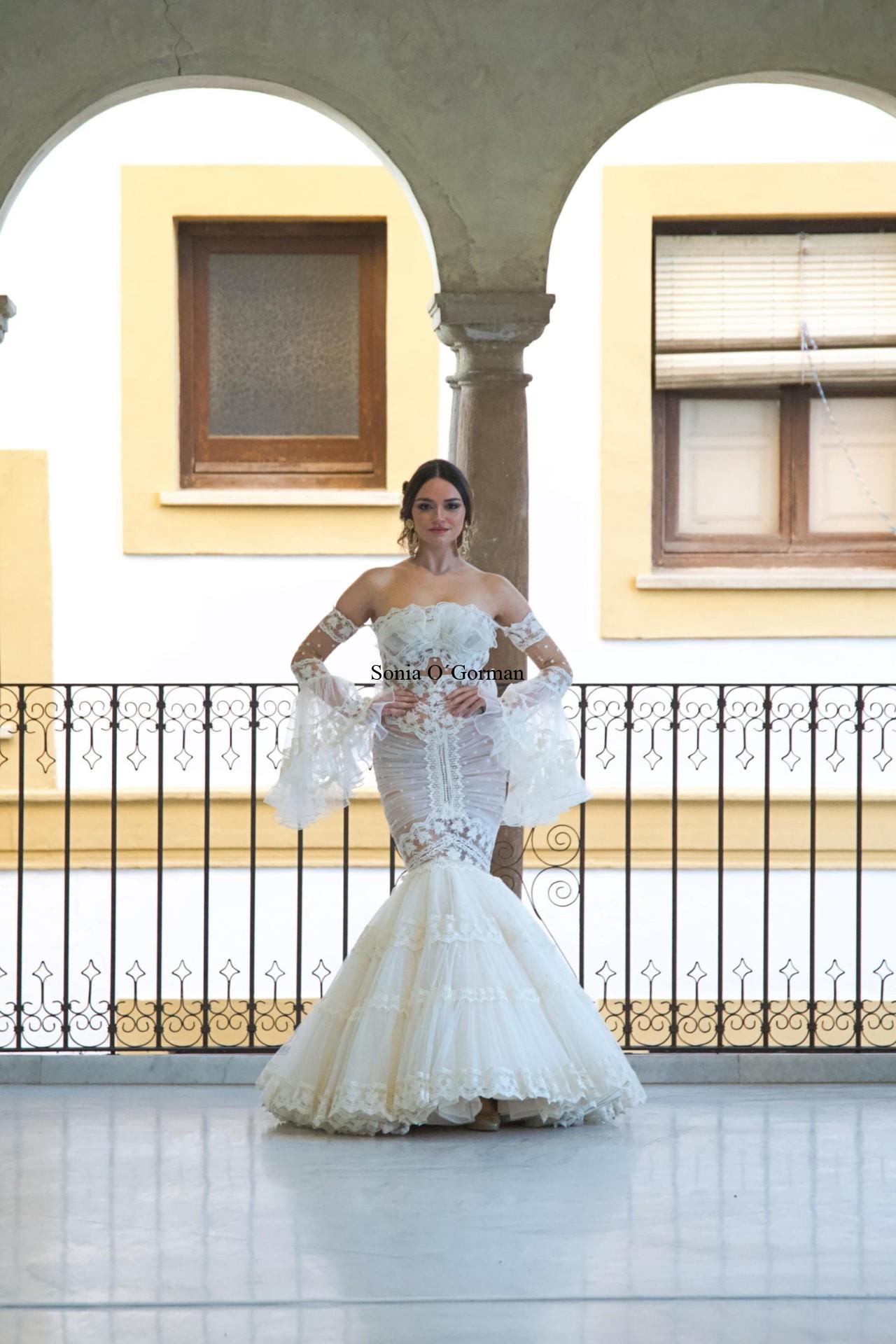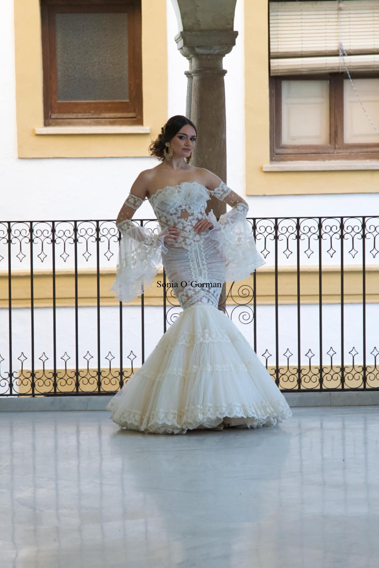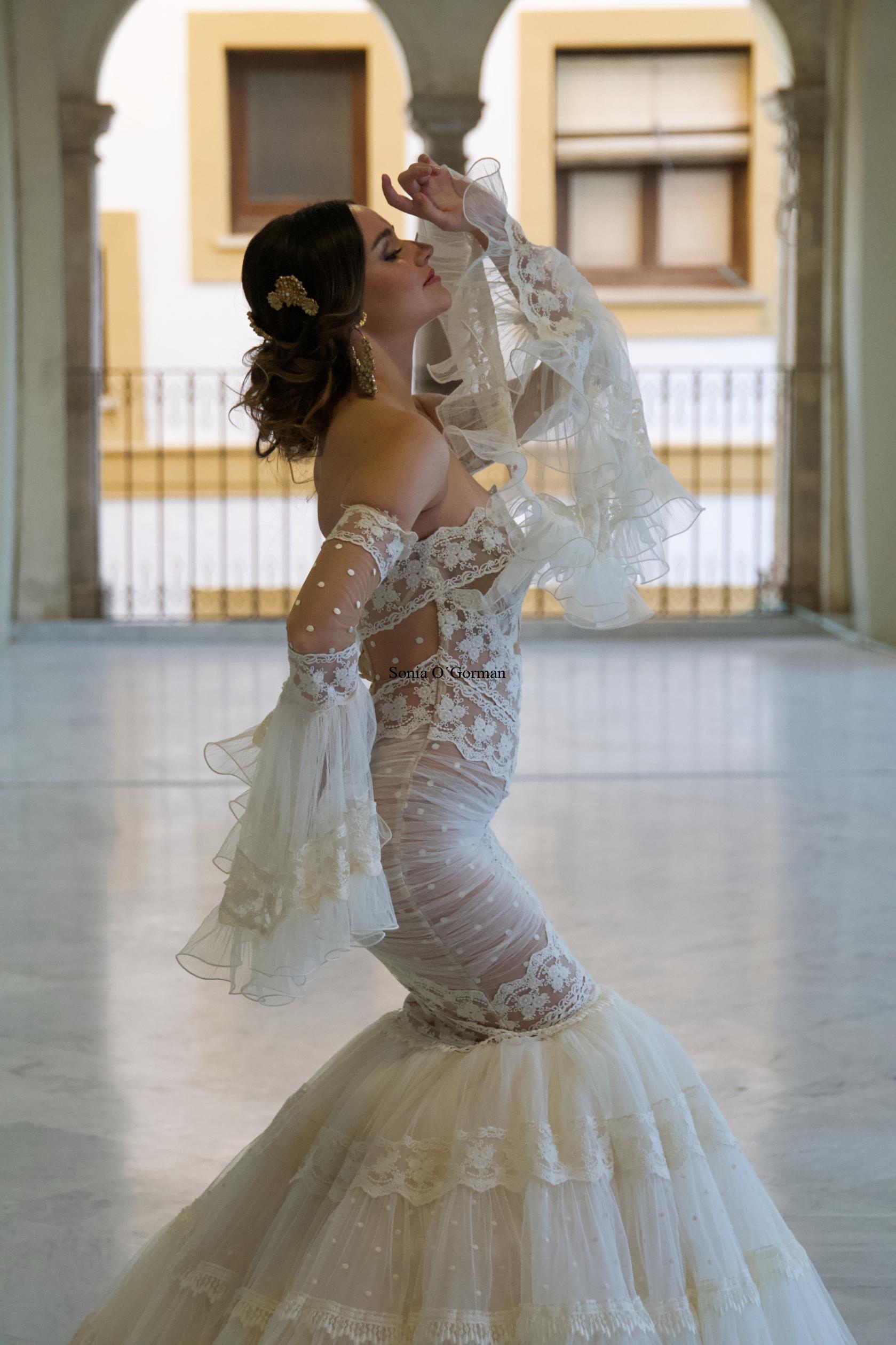 En esta ocasión, Teresa Ninu presenta una joya de su colección: un deslumbrante diseño nupcial que encarna la esencia del romance y la pasión del flamenco. Confeccionado con los más finos tejidos y adornos, este vestido de novia es una oda a la feminidad y la belleza atemporal.