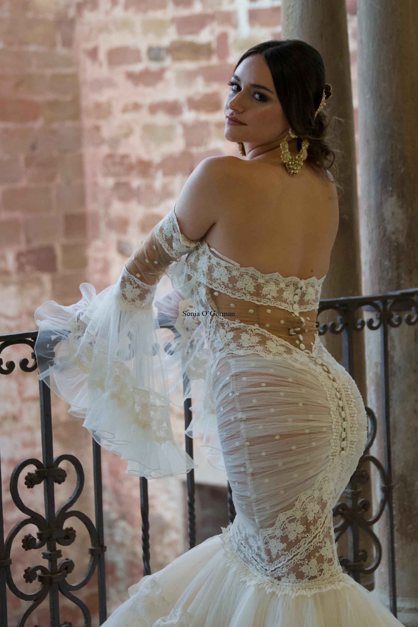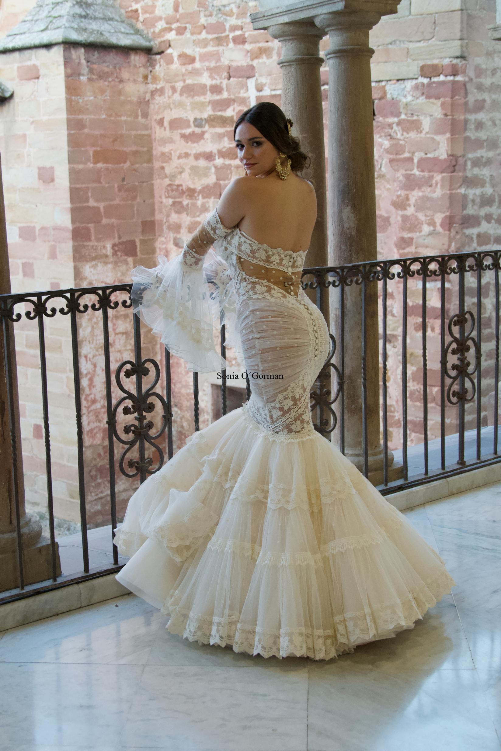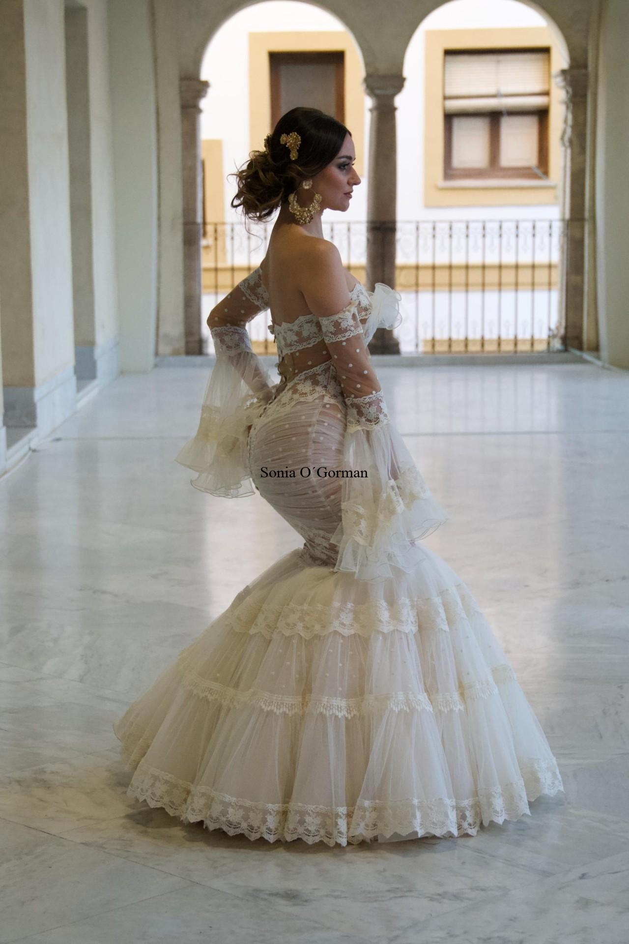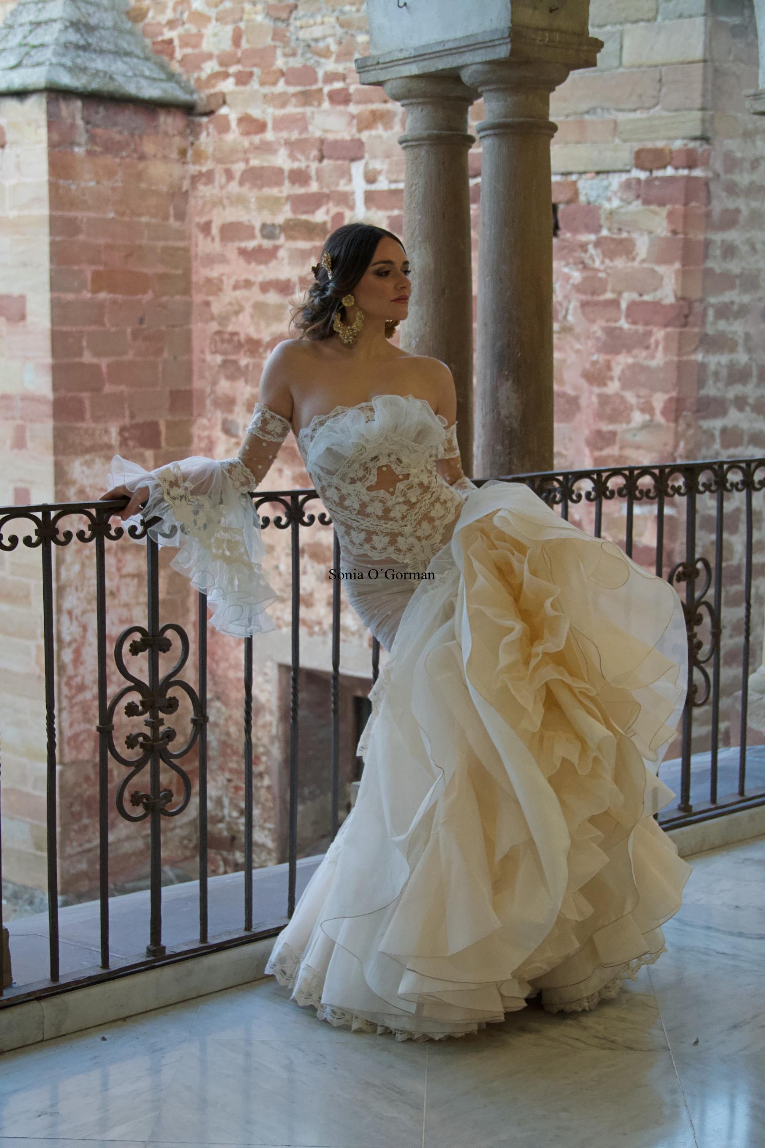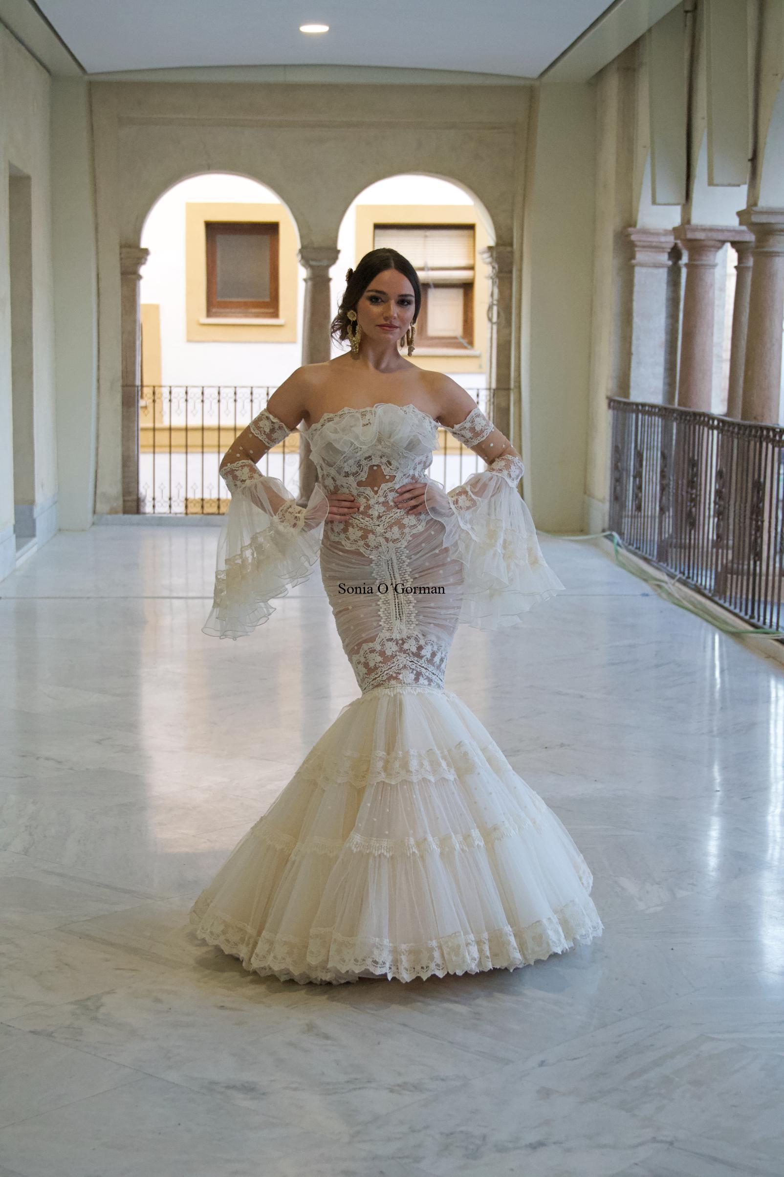 En esta ocasión, Teresa Ninu presenta una joya de su colección: un deslumbrante diseño nupcial que encarna la esencia del romance y la pasión del flamenco. Confeccionado con los más finos tejidos y adornos, este vestido de novia es una oda a la feminidad y la belleza atemporal.