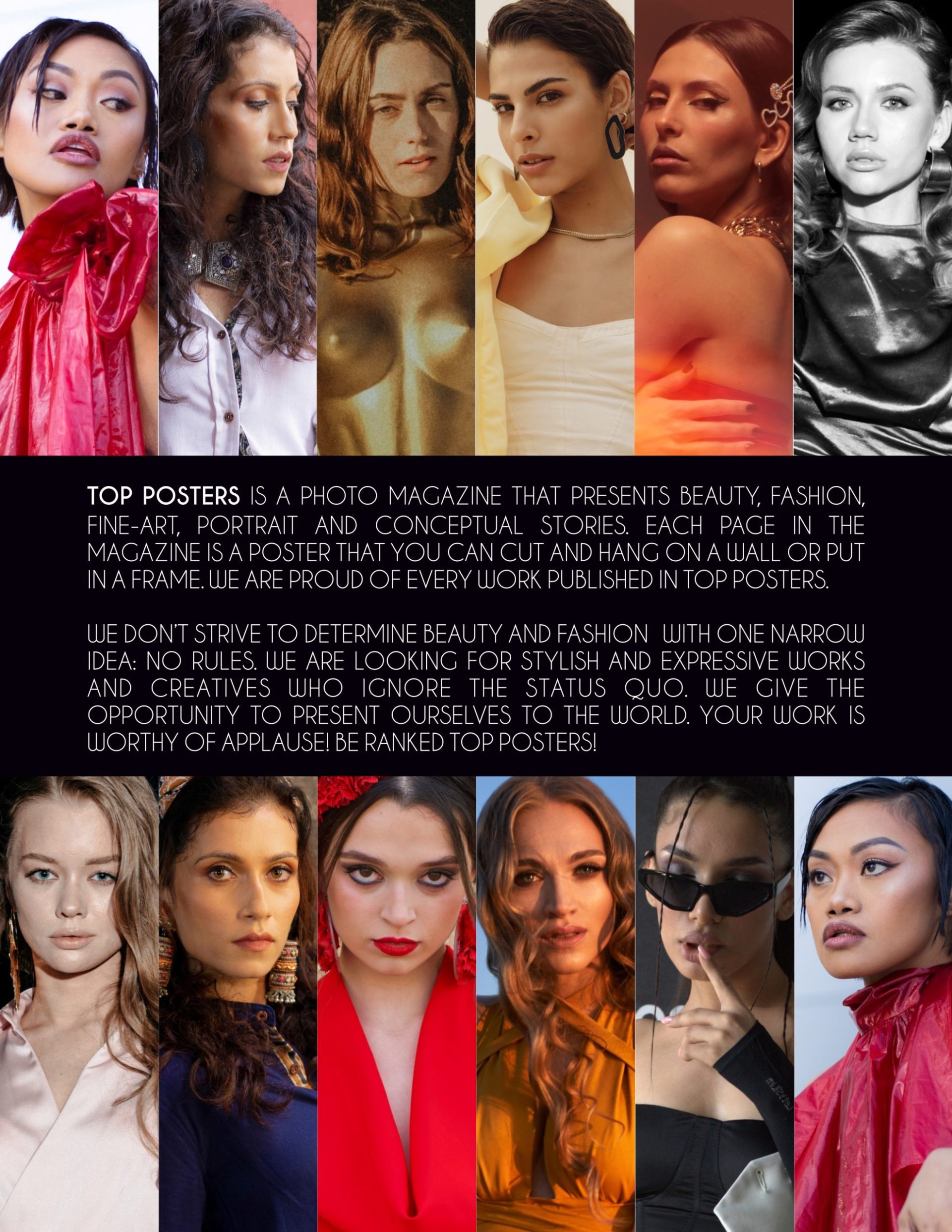 Top Posters es una revista fotográfica que presenta historias de belleza, moda, arte, retrato e conceptual. Nuestra revista está abierta a todos los fotógrafos de cualquier parte del mundo. No nos esforzamos por determinar la belleza y la moda con una idea estrecha: sin reglas. Estamos buscando trabajos y creativos elegantes y expresivos que ignoren el status quo.