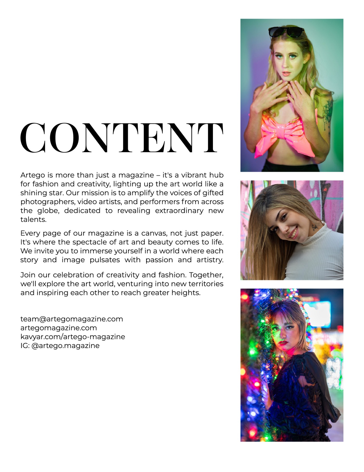 Artego es más que una revista: es un centro vibrante para la moda y la creatividad, que ilumina el mundo del arte como una estrella brillante. Nuestra misión es amplificar las voces de talentosos fotógrafos, videoartistas e intérpretes de todo el mundo, dedicados a revelar nuevos talentos extraordinarios. Cada página de nuestra revista es un lienzo, no solo papel. Es donde el espectáculo del arte y la belleza cobra vida. Te invitamos a sumergirte en un mundo donde cada historia e imagen palpita con pasión y arte. Únete a nuestra celebración de la creatividad y la moda. Juntos, exploraremos el mundo del arte, aventurándonos en nuevos territorios e inspirándonos mutuamente para alcanzar mayores alturas.